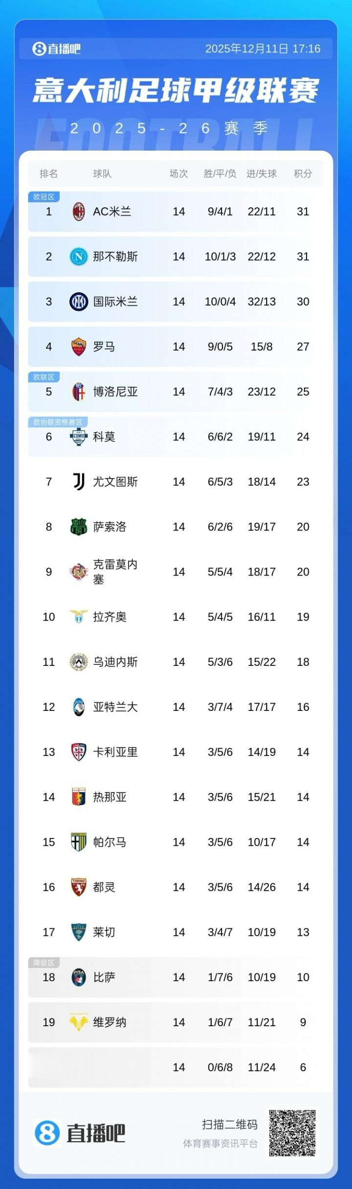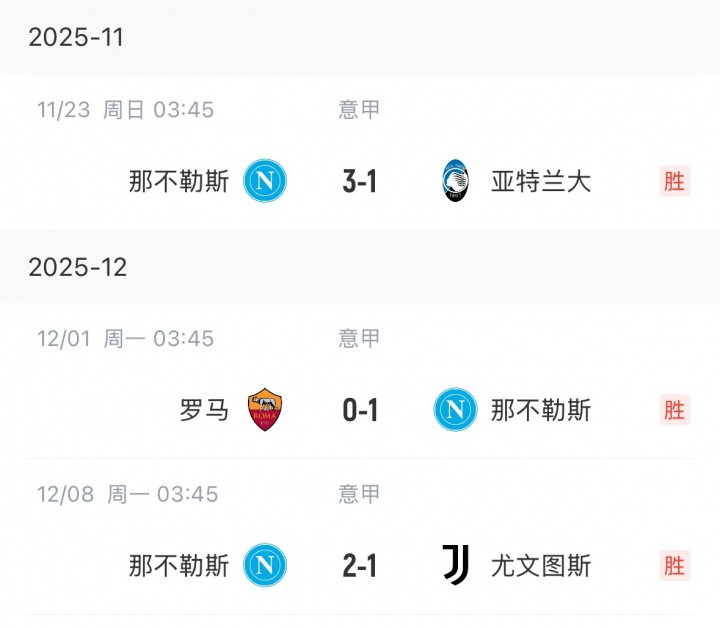 那不勒斯在意甲联赛豪取三连胜,与榜首米兰同积31分,居联赛次席。