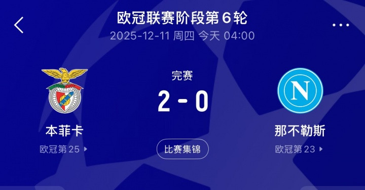 直播吧12月11日讯欧冠联赛阶段第6轮,那不勒斯客场0-2本菲卡,目前排名欧冠第23名。