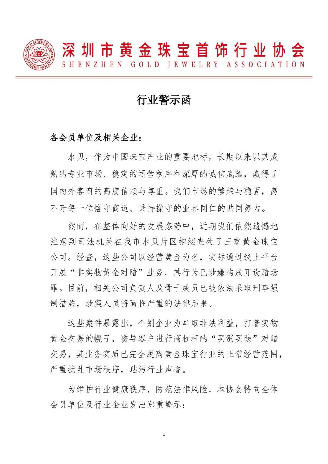 同时,为维护行业健康秩序,防范法律风险,深圳市黄金珠宝行业协会特向全体会员单位及行业企业发出郑重警示: